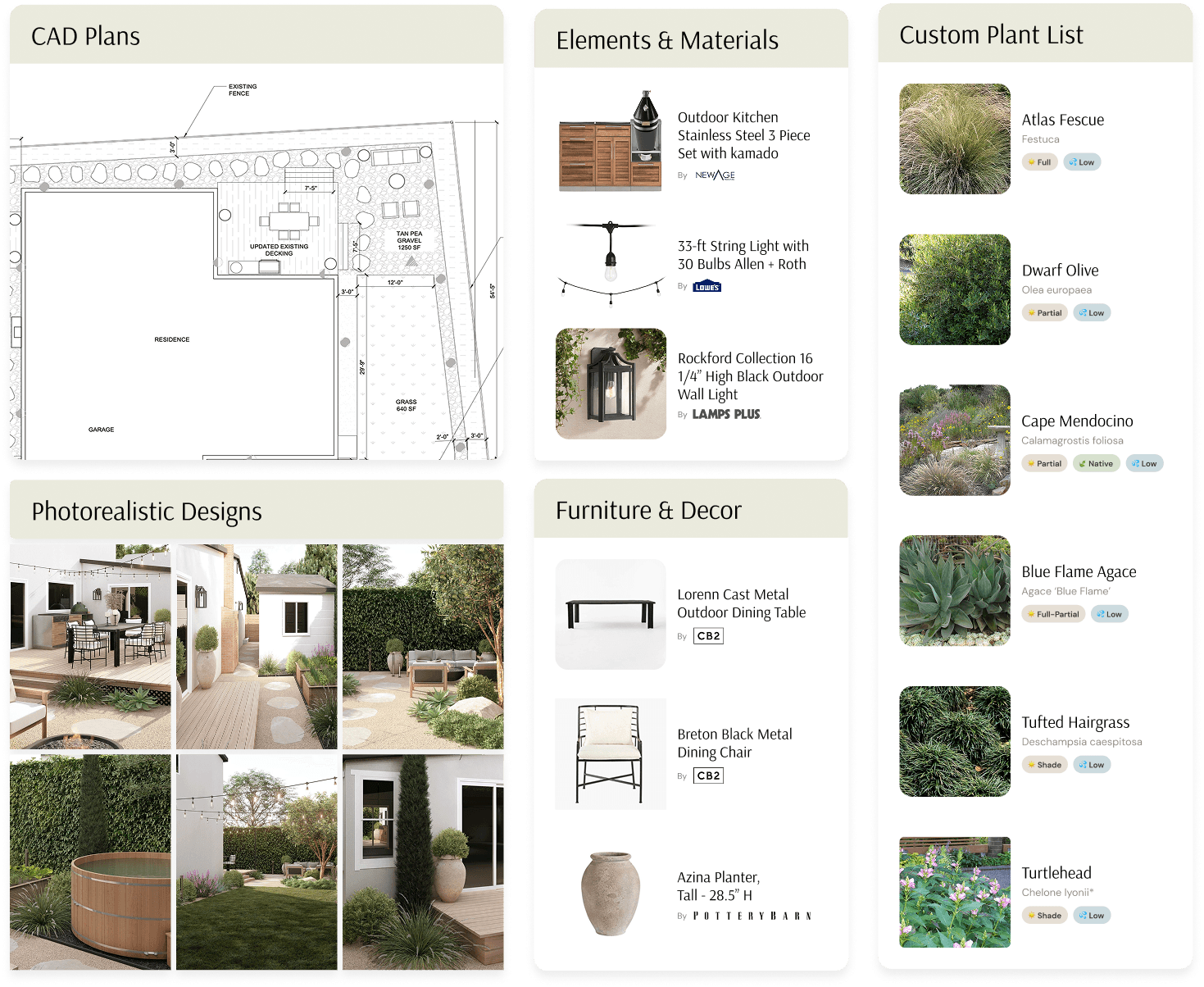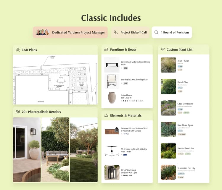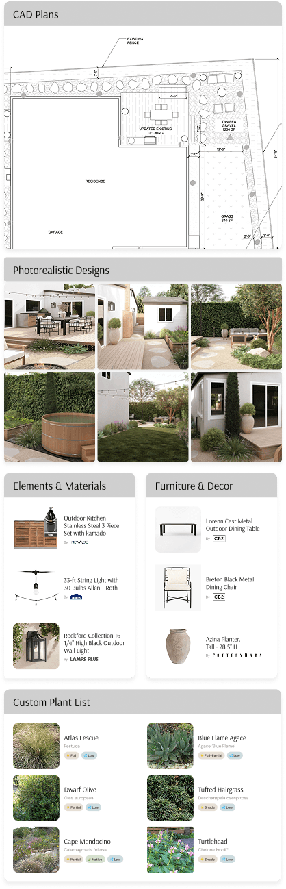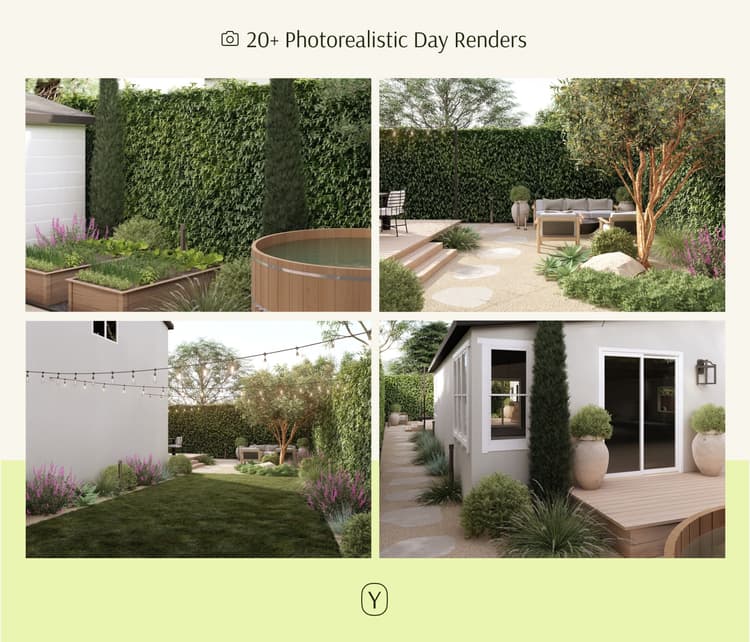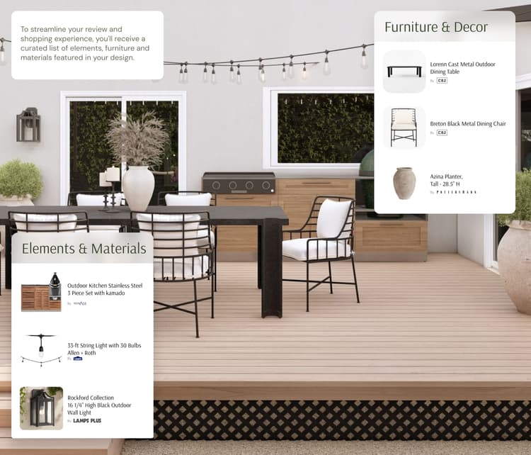 A guided design experience with photorealistic renders and a dedicated project manager to bring your vision to life. Includes backyard and side yards.