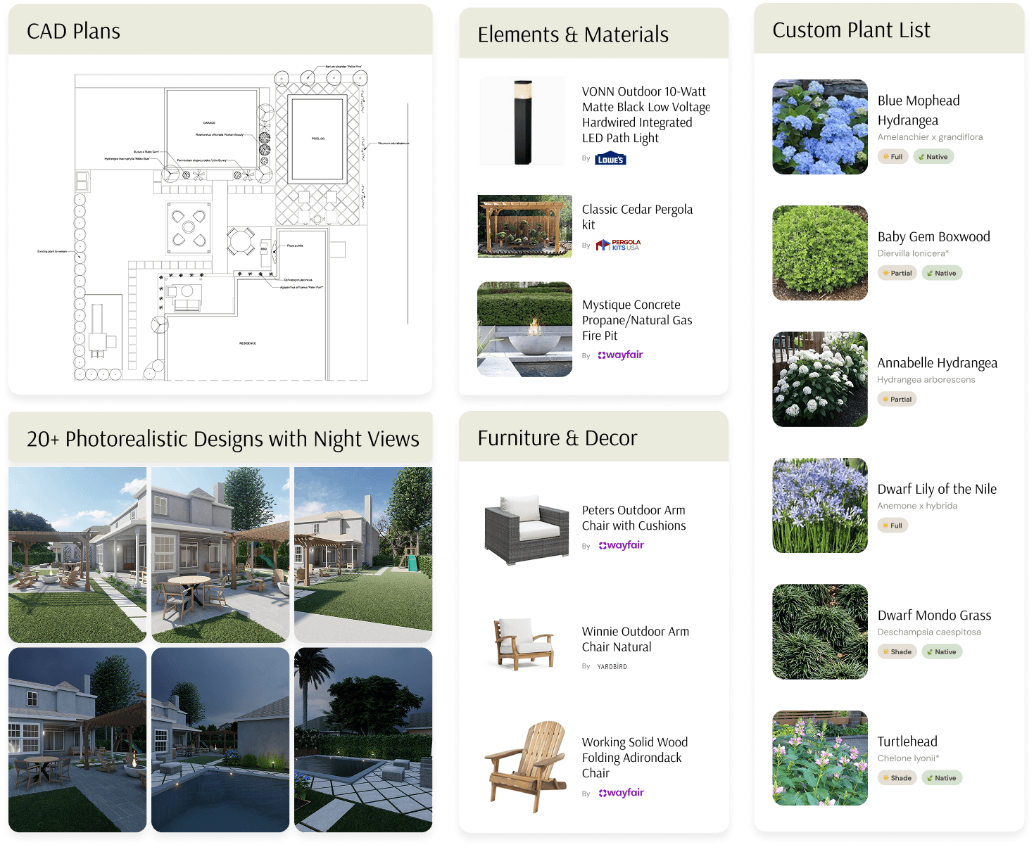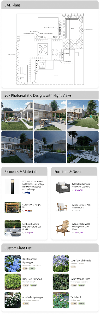 Our most comprehensive design experience, with expert guidance, day-to-night renders, and a cost advisor to help you build with confidence. Includes your entire backyard and side yards.