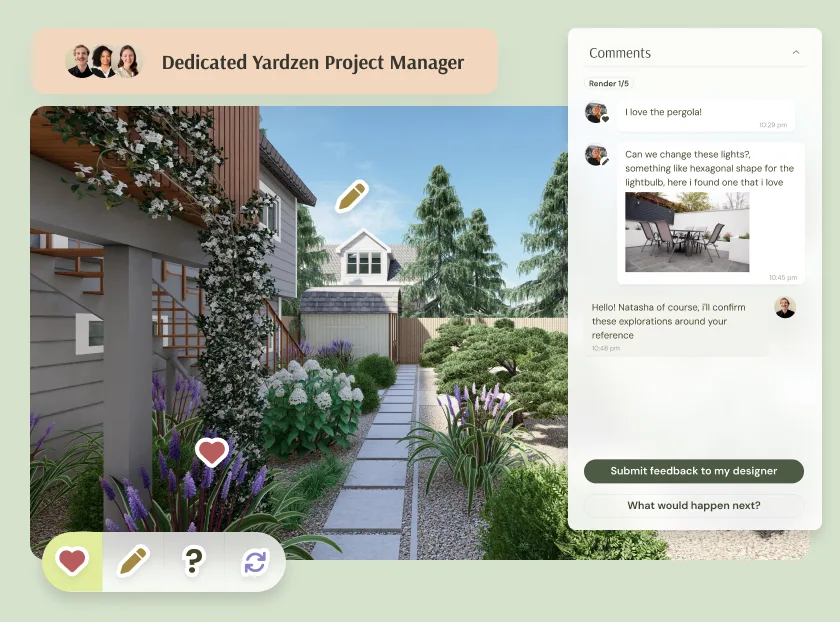 The team at Yardzen was excellent at grasping my vision for my front yard landscaping project. The platform was so easy to use and I loved that you can leave detailed feedback for revisions and connect anytime with design team.